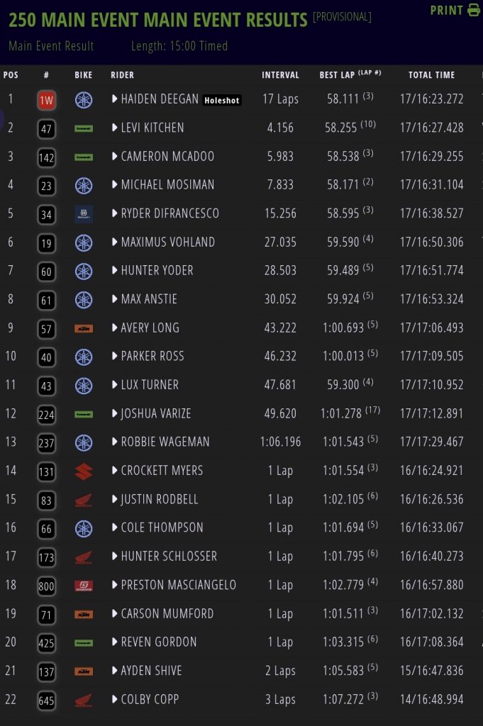 Haiden Deegan holeshot and controlled the main event to take his fourth win in a row as Levi Kitchen started outside the top ten but rode superbly to take second and was the fastest rider on the track coming through the field. Cameron McAdoo passed Michael Mosiman with two laps to go to get on the podium in third. Max Anstie had a terrible start and came back to eighth in another frustrating night for the Brit.