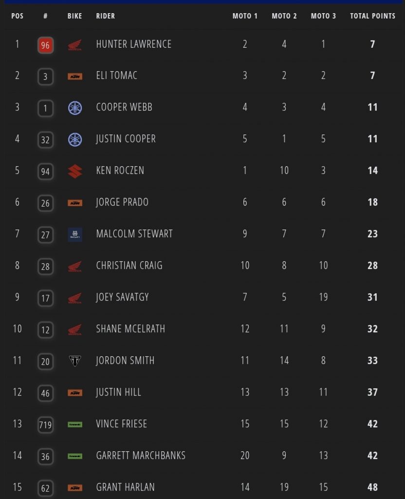 Moto three: Hunter Lawrence and Eli Tomac gated 1-2 and it was Lawrence who stayed out front, even pulling away halfway through for a decisive win with Roczen coming from just inside the top ten to third leaving him to wonder what could have been without the race two crash. Webb took fourth with Cooper fifth and Prado sixth again.