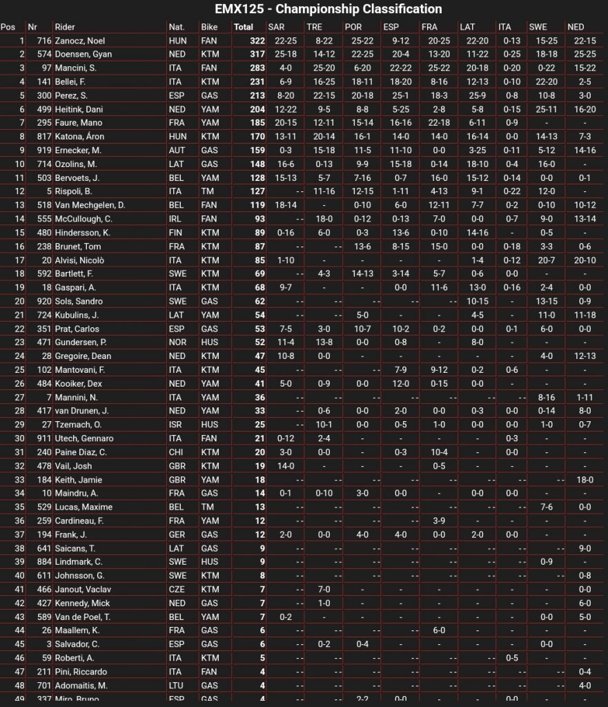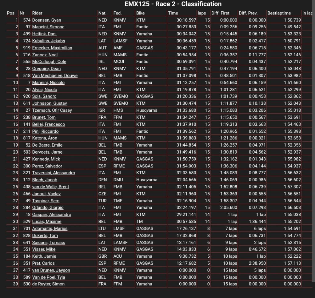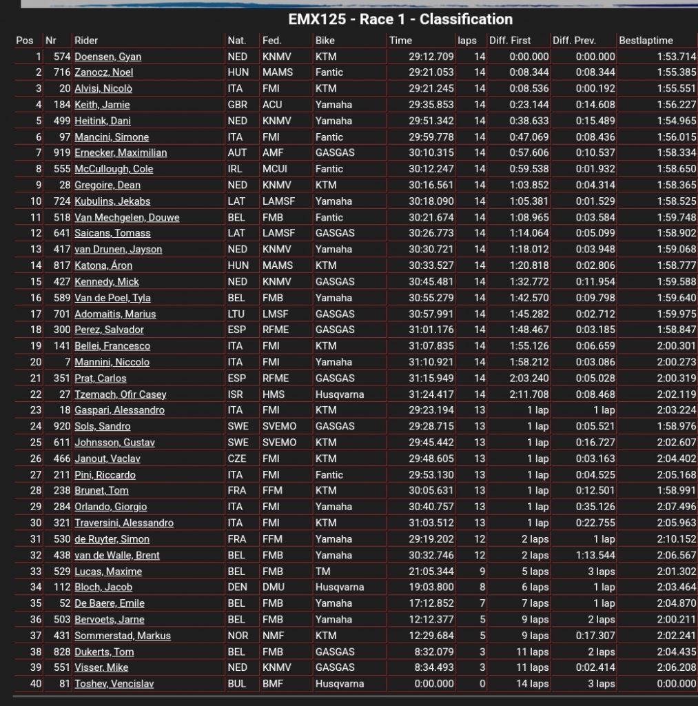 Gyan Doensen dominated the moto in front of the home crowd with Zanocz just holding off Alvisi for second. Cole McCullough took 8th coming from outside the top ten to do it. Jamie Keith was superb for fourth in his first EMX125 moto!