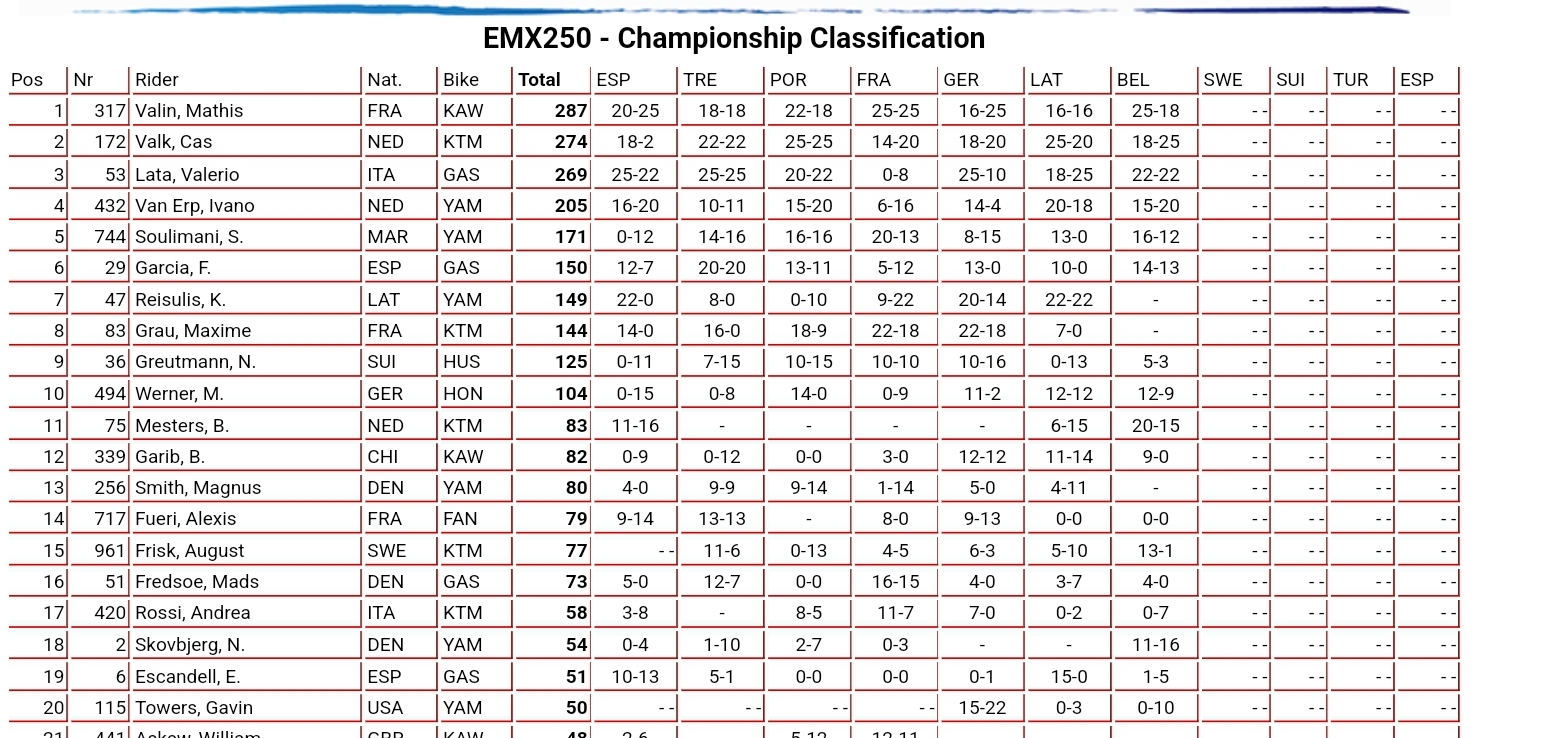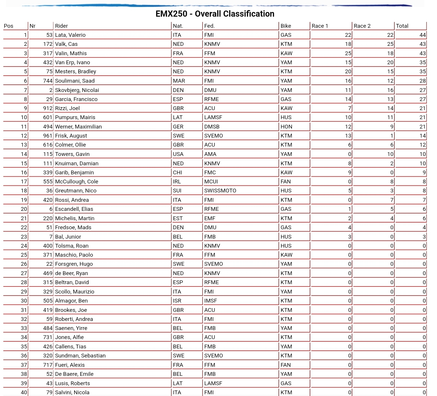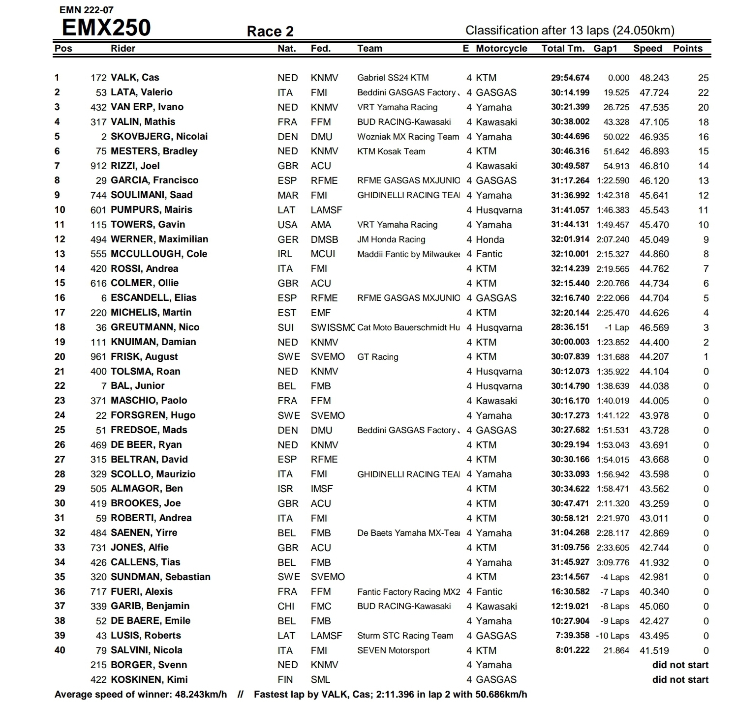 Mathis Valin took the win working his way to the front with flow as Lata regrouped halfway through to get back into second. Cole McCullough looked set to take 11th until a late fall dropped him down the order to 16th just behind Ollie Colmer (McCullough later lost ten spots due failing the sound test). Joel Rizzi had to come through the field to 14th.