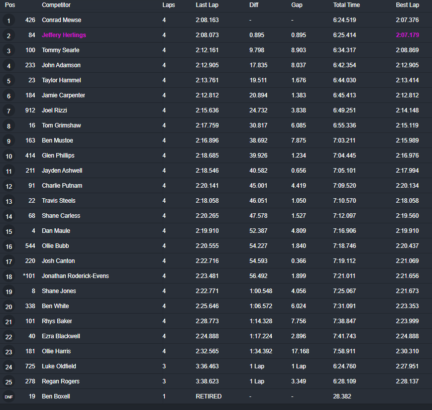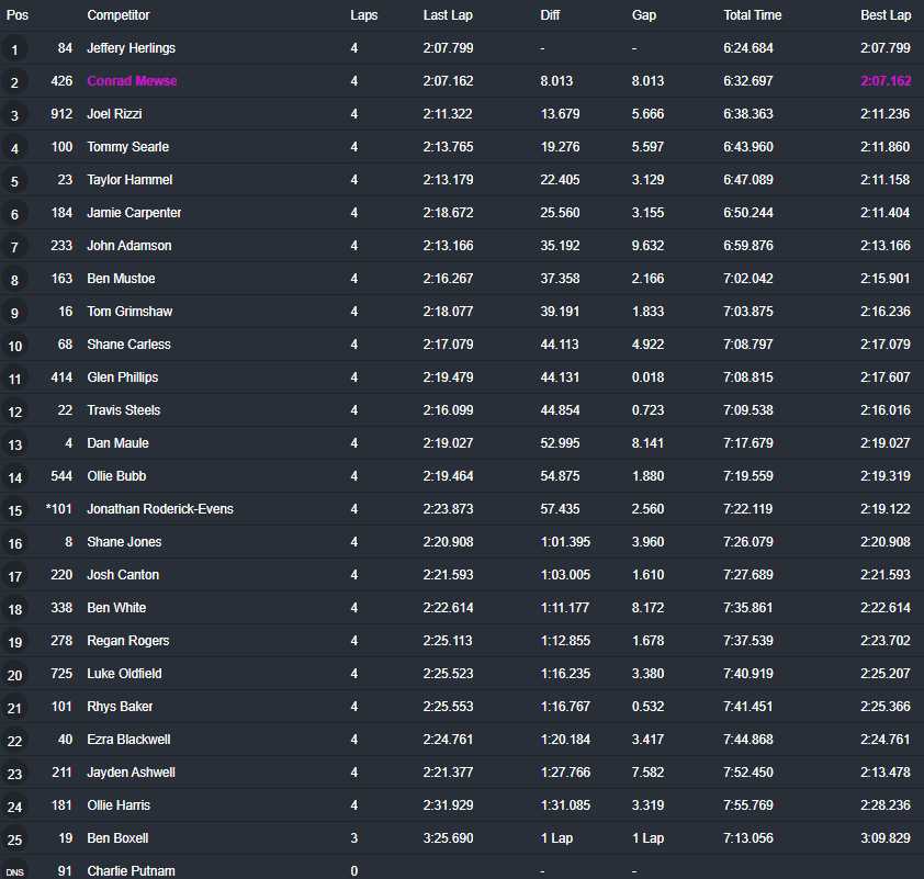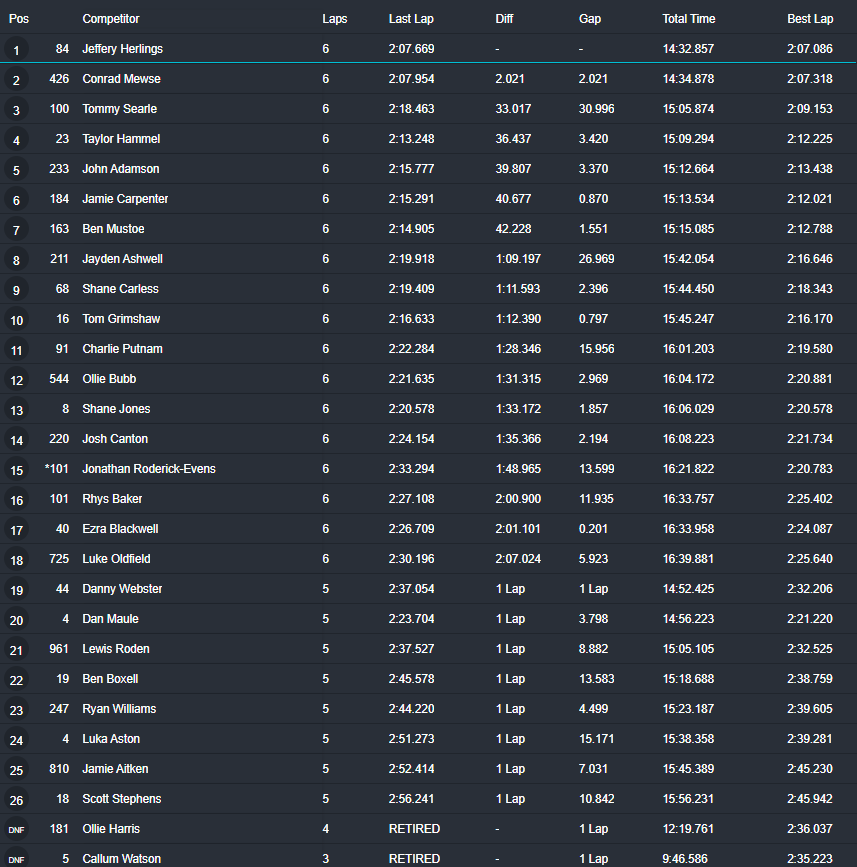 Superfinal: Herlings won the superfinal which was an extra two laps. Mewse rode well to finish second only two seconds behind. Searle was third over thirty-seconds behind after six laps to show the pace the front two were running. Hammal went one better in fourth with Adamson rounding out the top five.