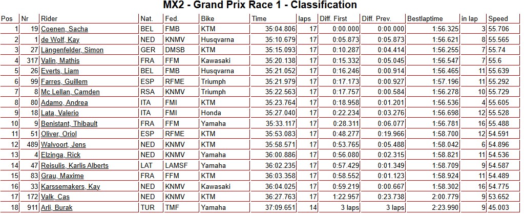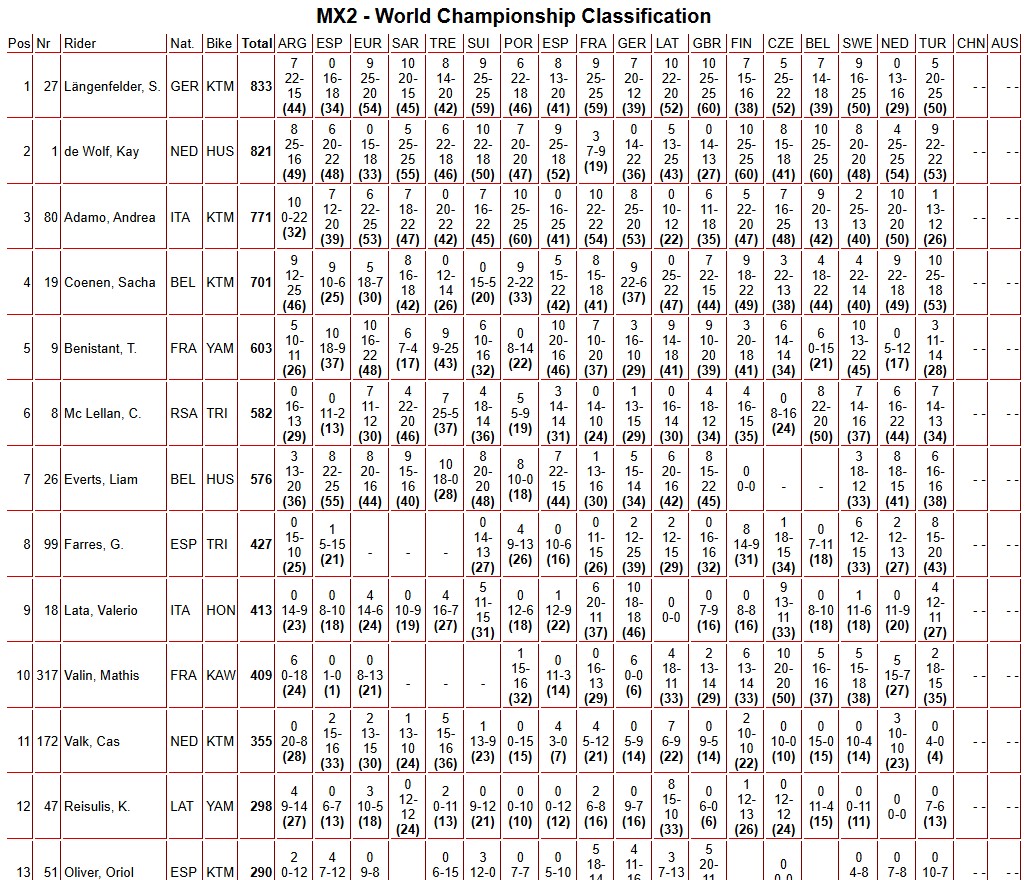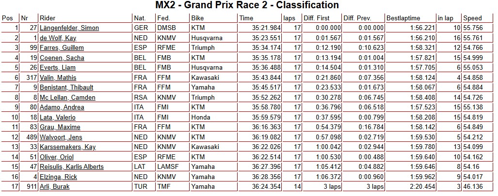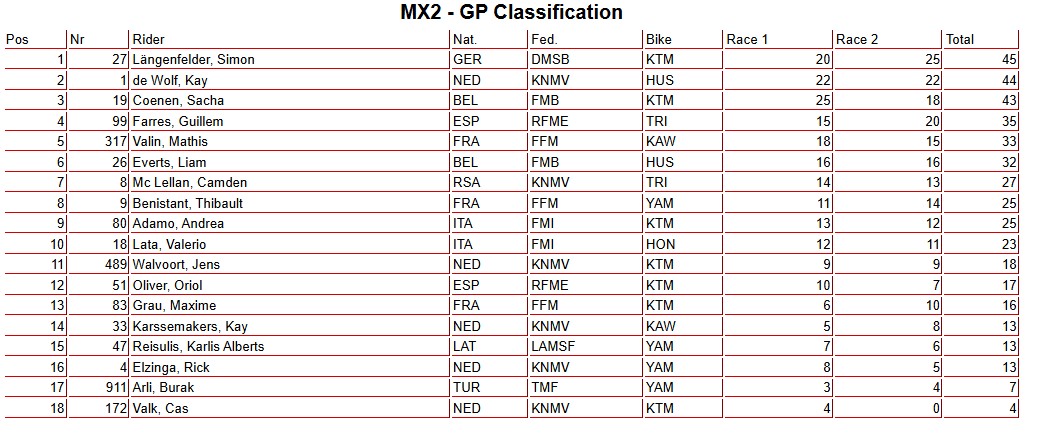 Längenfelder was able to make moves on Coenen and Farres and at one stage had a lead of around eight seconds – but then he then had a small crash which allowed Farres and de Wolf close the gap. De wolf then passed Farres and went after the German in what was a fantastic watch but Längenfelder held on to take the win and the overall win – the 9th GP win of his career but the most important one to date. There’s now 12 points in the championship race.