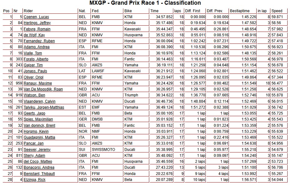 Race One: It was Tom Vialle who got the holeshot on his Honda – it didn’t take Jeffrey Herlings long to get himself to the front but Lucas Coenen was the man on the move. The Belgium passed Febvre, Vialle and Herlings to get himself to the front and them dominated in very tough conditions.