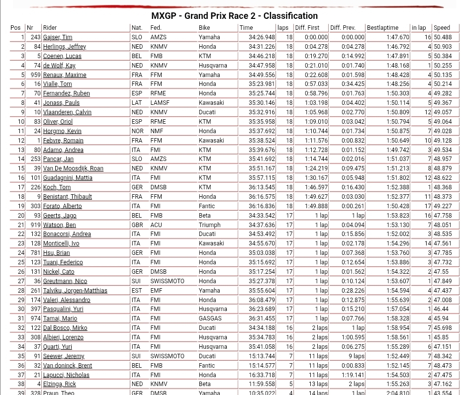 Herlings said: “I think I showed I had the speed all weekend. Even though I was in traffic I put down the fastest lap time. First moto, I came from about 15th to first, the second moto, tenth to second. Just couldn’t manage to pass Tim, he is always good at this track so it is no shame. The track didn’t allow me to get past him and he had good lines. We had a good day for the championship.”