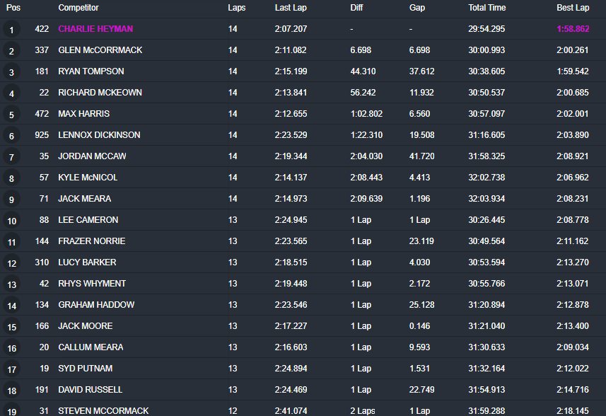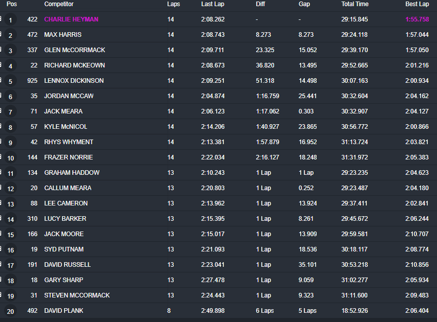 MX2: Charlie Heyman was strong and took both moto wins ahead of Max Harris in the first moto. Glenn McCormick was strong to finish second in the second moto for second overall. Richard McKeown had a good day finishing 4-4.