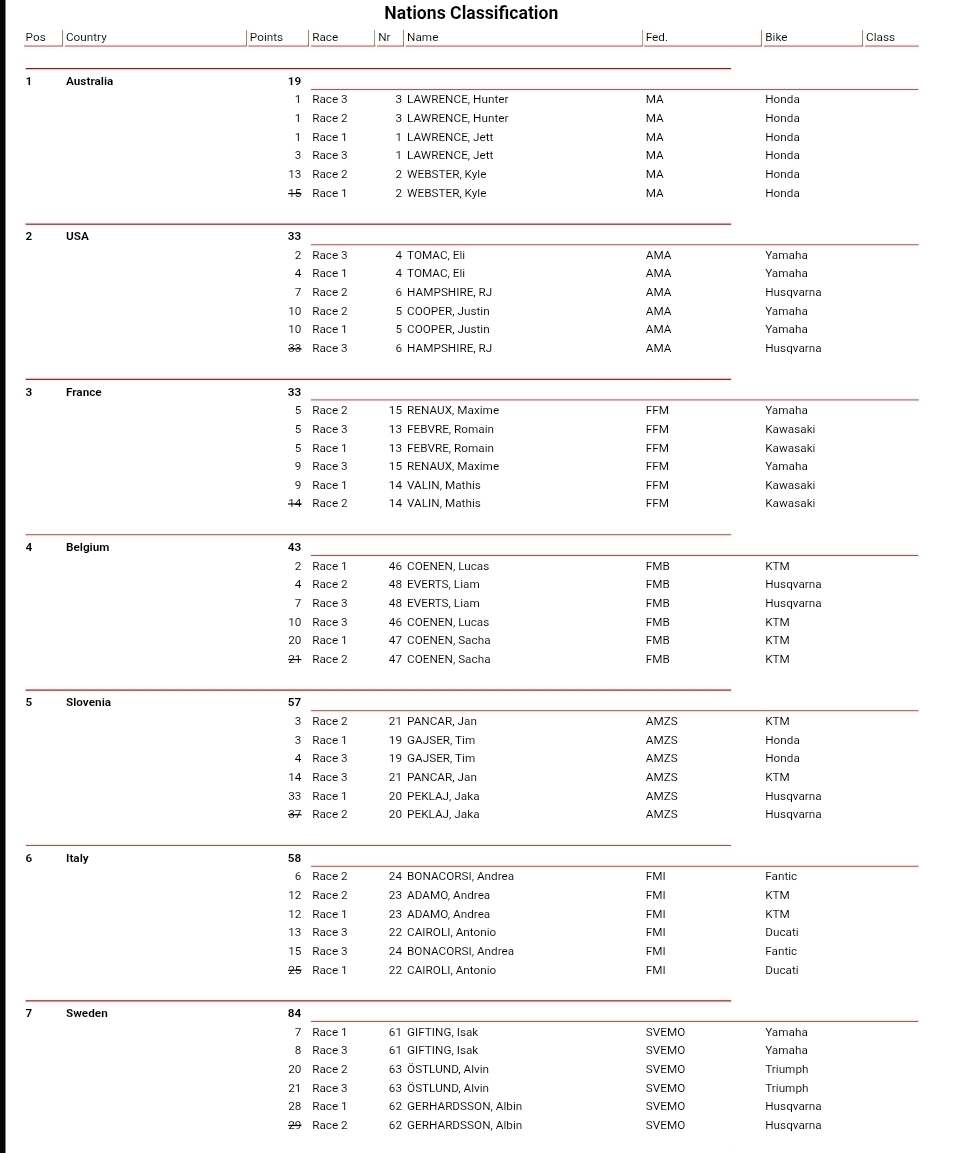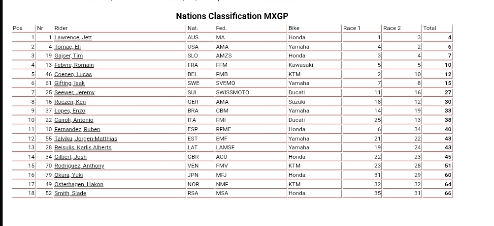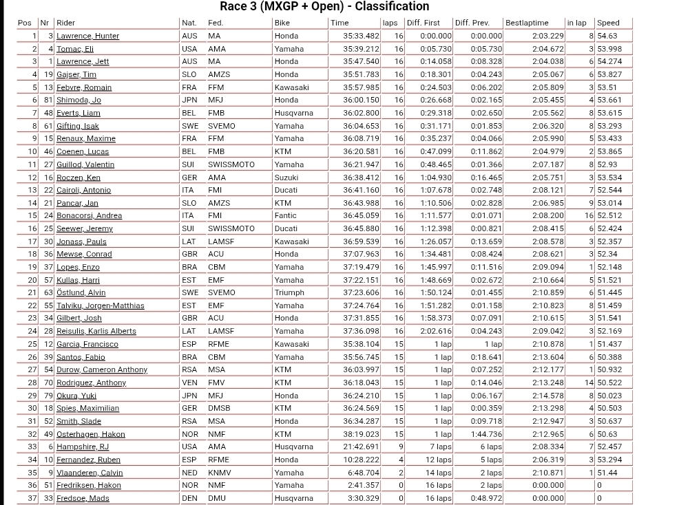 MXGP + Open race result: Hunter Lawrence took the win with Jett Lawrence coming from 16th to third to secure the win for Australia as Lucas Coenen crashed out of second knocking Belgium off the podium with Tomac fighting to second giving USA second on the podium and France third.