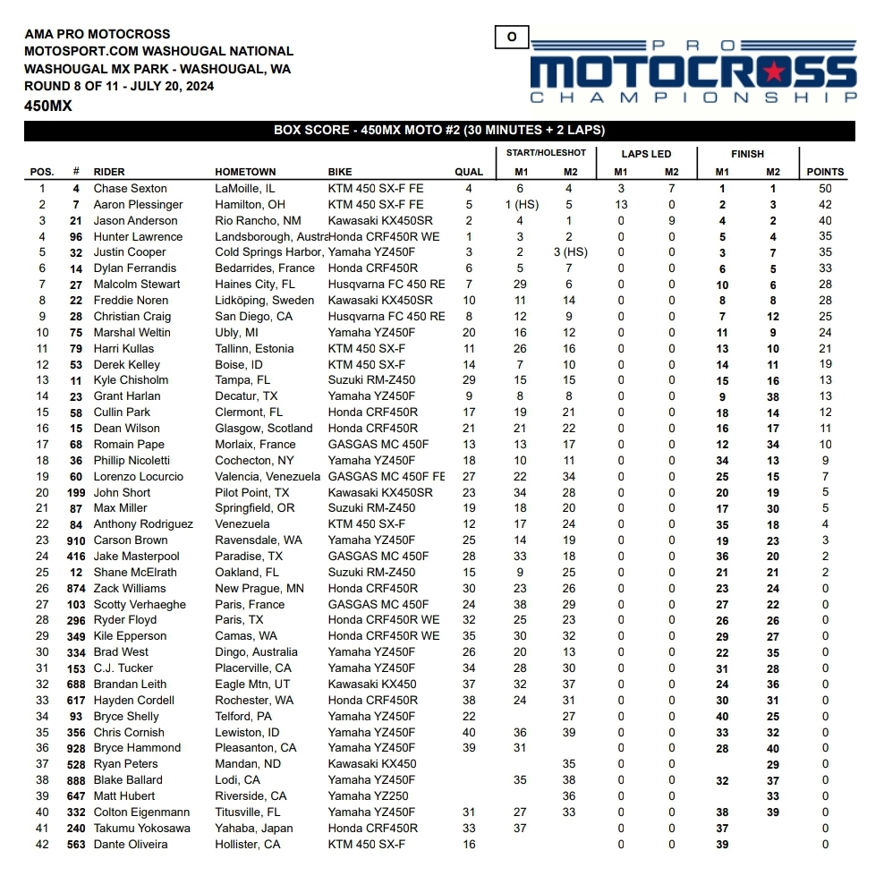 In moto two Sexton ran down Jason Anderson for the win after Anderson led for twenty minutes following a beautiful two for one pass on Cooper and Lawrence to take the lead and pull a five second gap.