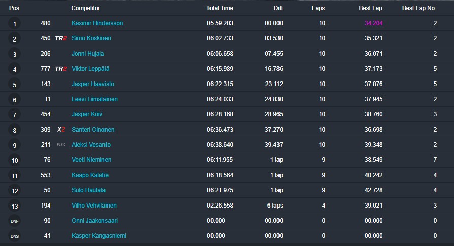 Simo Koskinen took second place in the SX2 class final ahead of Jonni Hujala. Viktor Leppälä was fourth and Jasper Haavisto fifth.