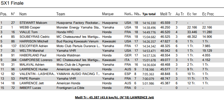 Final: Stewart had the perfect night to win the final – three from three during day one in Paris. It was a night to forget for the Lawrences. Jett actually had a great start but was tentative around the first couple of corners dropping to third – then he crashed and looked pretty sore. Hunter who was second then crashed up the whoops.
