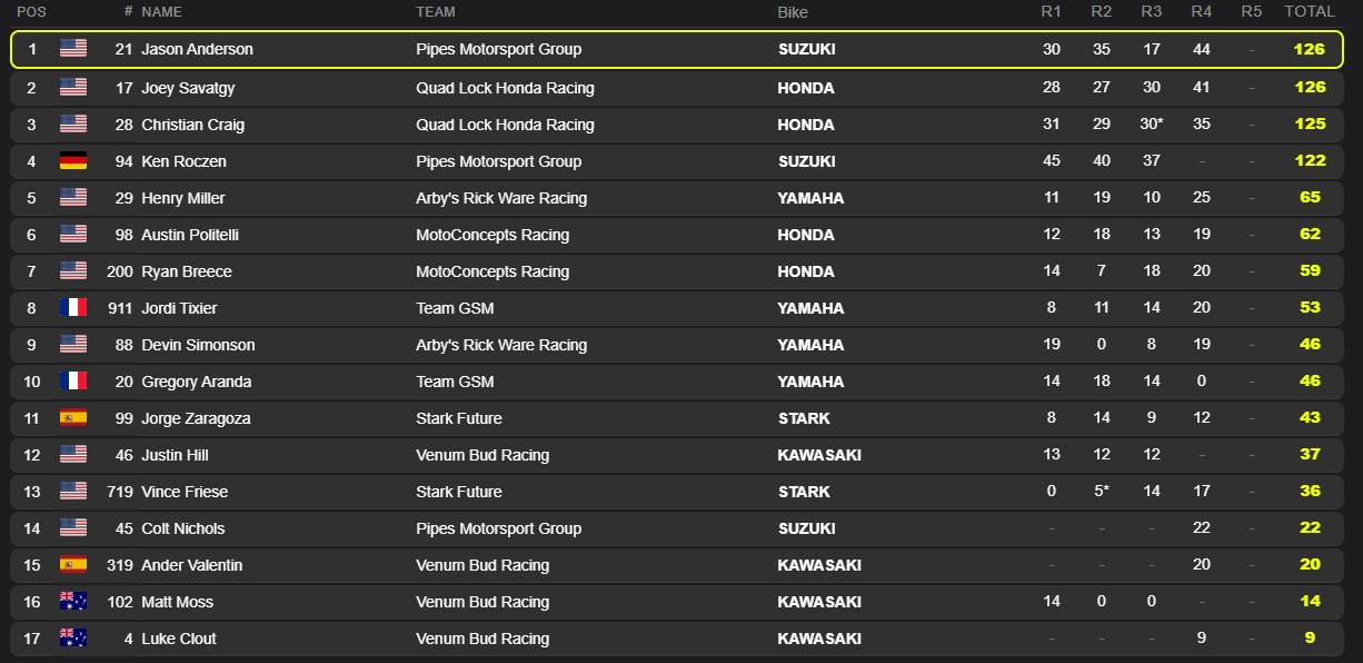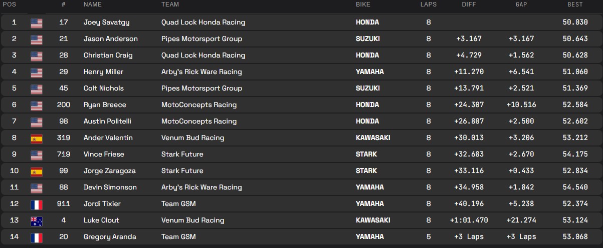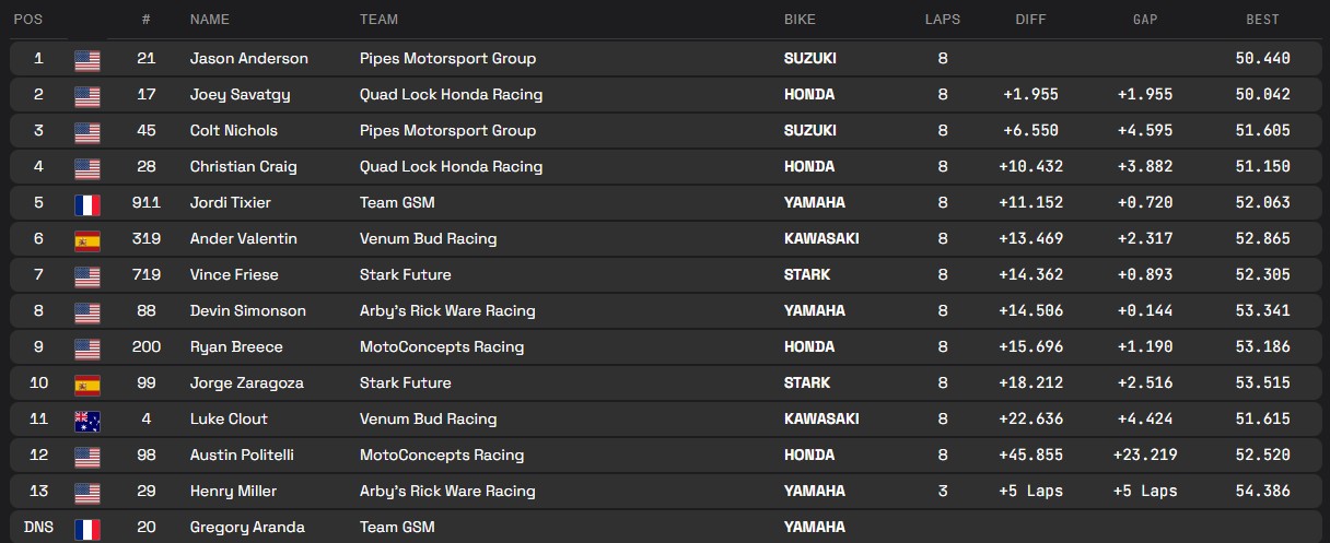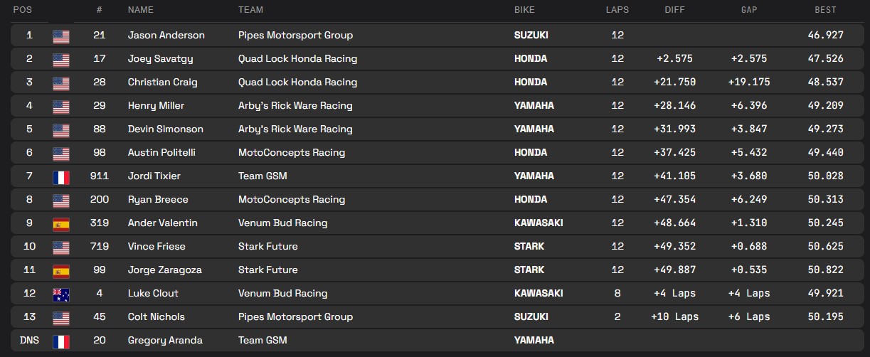 Race One: Jason Anderson held the early lead but Joey Savatgy was able to make a move to get into the lead and take the win in very soft and gnarly conditions.