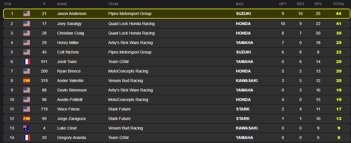 Final: Anderson made sure he was leading around the first corner and the Suzuki rider raised his game when it mattered. Savatgy tried to catch him but just couldn’t get close enough and Anderson brought home an impressive race win to get himself into the championship lead but he’s tied on points with Savatgy with Craig only a point behind.