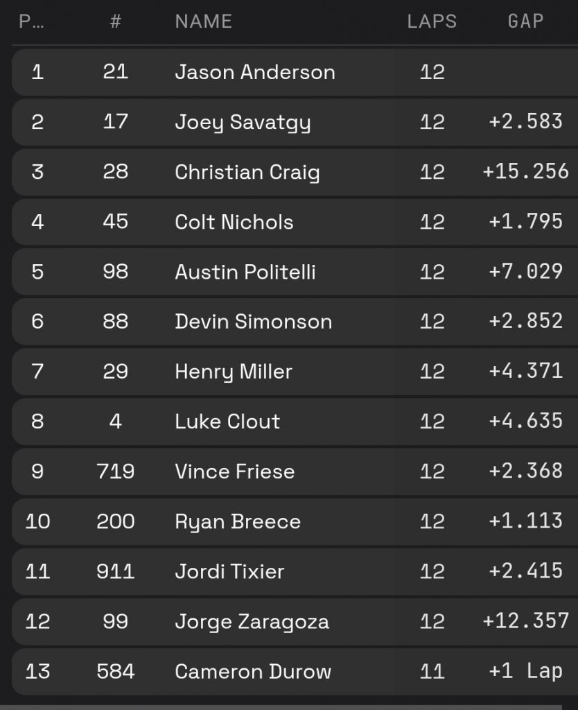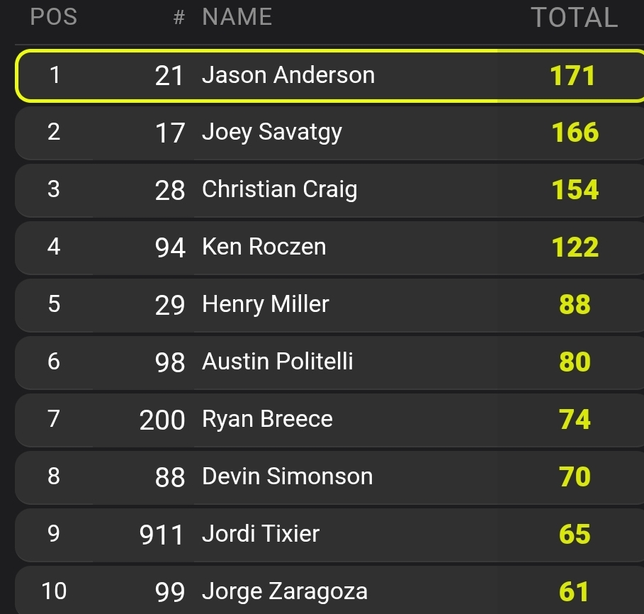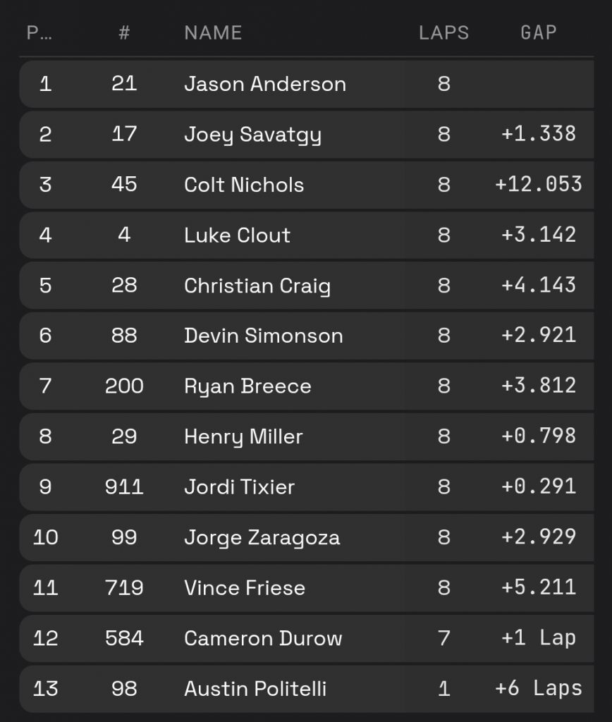 Anderson said: “Man, that’s racing. Joey kept me on my toes he is so underrated for how good he is. I just want to thank my team, my family, my daughter. I am excited, I just want to keep this momentum going.”