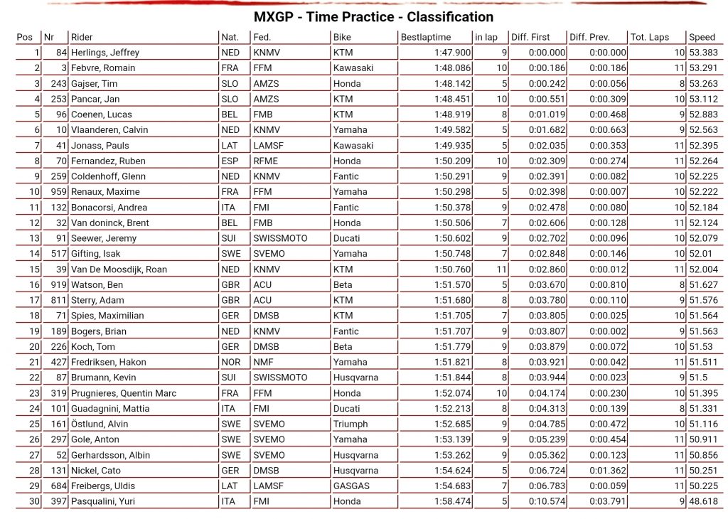 Jeffrey Herligns and Thibault Benistant went quickedt in TP in Sweden asn Herlings shows he is getting back to the pre broken collarbone form with Tim Gajser straight on the pace in third!