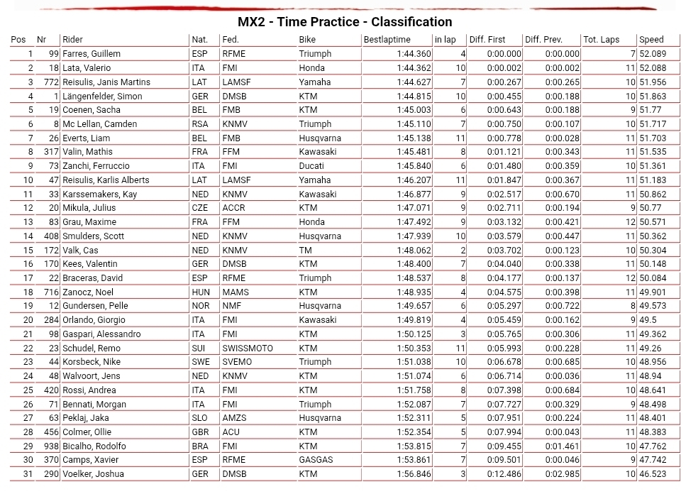 Guillem Farres put his Triumph on pole in MX2 from Valerio Lata with Janis Reisulis proving himself on every condition so far taking third.