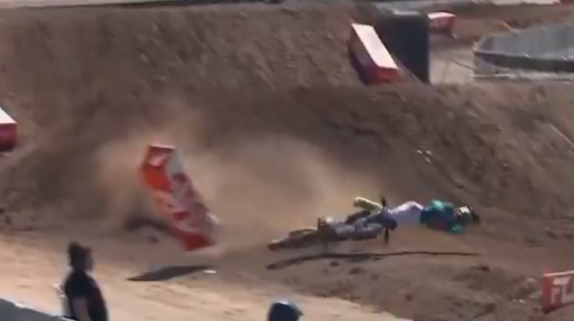 The Kiwi isn’t long back from that sickening crash in supercross that left him with a broken arm so it was nice to see him somehow walk away from this big hit!