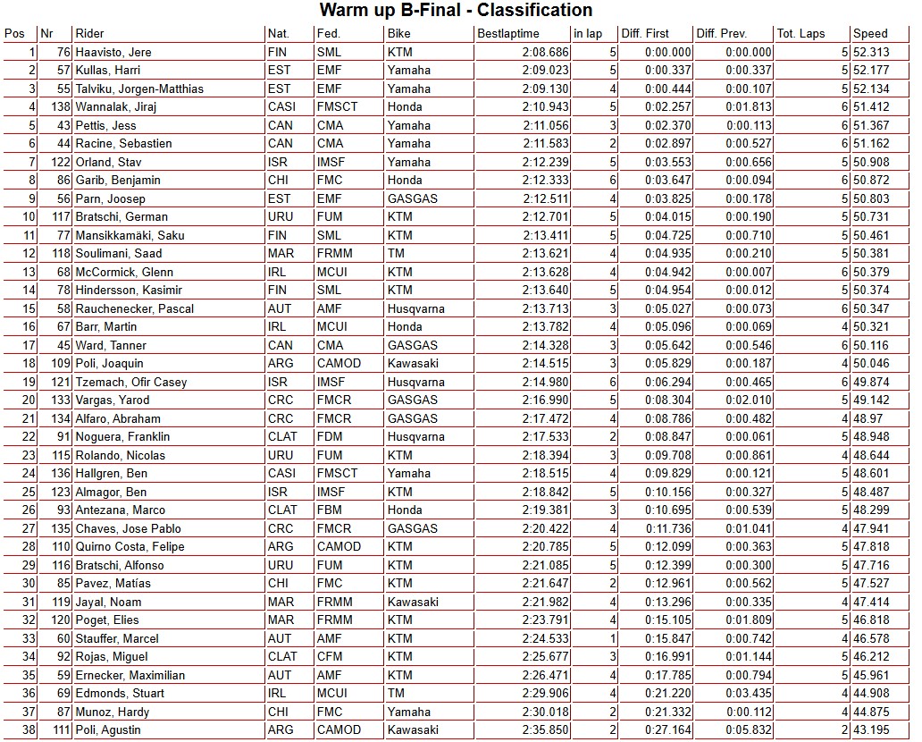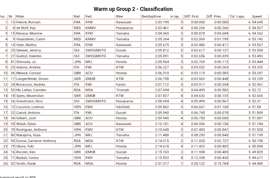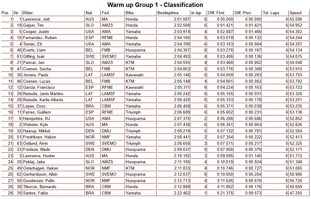 Results: AMA + MXGPWarm up results: Ironman MXoN Andy McKinstry22 seconds ago1 mins Image: MXGP/Infront Moto Racing Facebook Twitter WhatsApp Messenger Email Jett Lawrence was quickest in warm-up from Tim Gajser with Kay de Wolf and Justin Cooper very fast on their 250 machines. Group 1: Group 2: This article continues below B Final warm up: Post navigation Previous: Race results: BluCru 125, 85 + 65 – Ironman MXoN